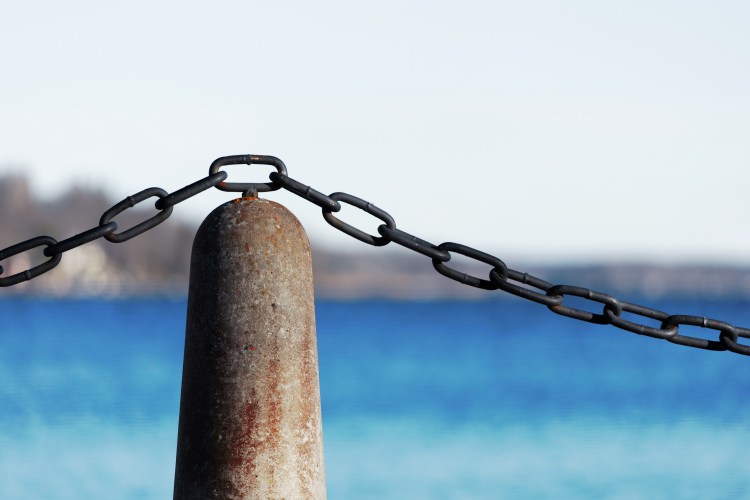 Efter att ha provat några olika idéer lade jag märke till att kedjan som utgör staketet mellan gångvägen och parkeringen bildar en vågig linje, som man kan föreställa sig även om man inte ser hela. Dessutom så blir det en tydlig kontrast mellan å ena sidan järnets kalla tyngd och betongens hårdhet, och andra sidan det mjukt böljande vattnet bakom. För även om bakgrunden är så ofokuserad som den är, så hoppas jag att den som tittar på bilden uppfattar havet, öarna i bakgrunden och himmelen ovanför.